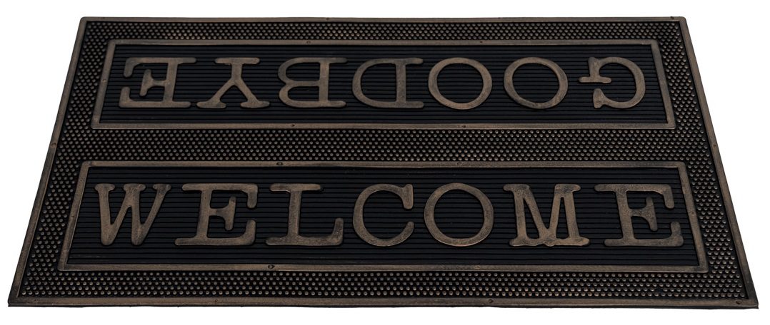 Je bent hier: Home / Deurmatten / Rubberen deurmat met Welcome / Goodbye in brons