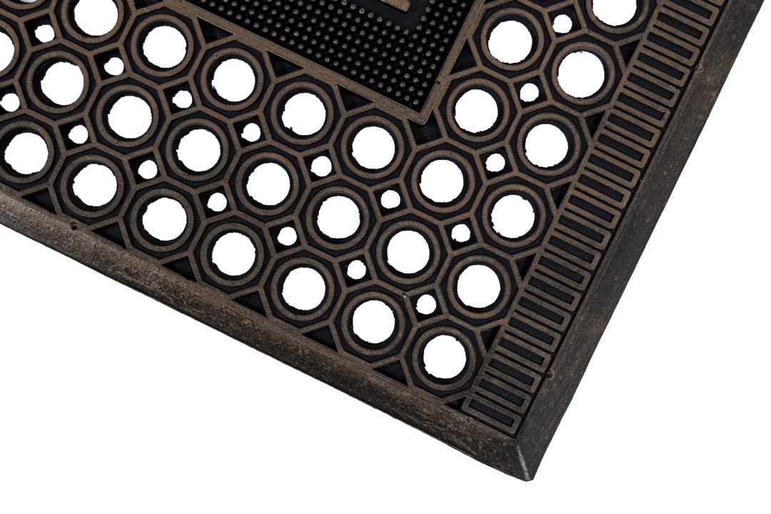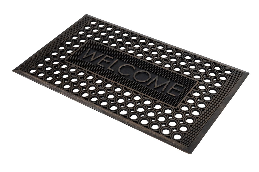 Verhoog de functionaliteit en uitstraling van je entree met deze decoratieve rubberen schraapmat. Deze veelzijdige mat is ideaal bij de ingang van je huis, garage of werkplaats. Het duurzame rubbermateriaal biedt uitstekende grip en bescherming tegen vuil en vocht. Door de open ringen wordt het vuil van uw schoenen geschraapt en dat blijft achter in de openingen. Het koperkleurig dessin met tekst Welcome voegt een vleugje elegantie toe, terwijl het functionele blijft. Een rubberen mat is weersbestendig en slijtvast waardoor ze heel lang zal meegaan. Een groot voordeel van een rubberen mat is dat ze zeer eenvoudig te reinigen zijn, gewoonweg afkloppen of afspoelen en ze zijn terug klaar voor gebruik.