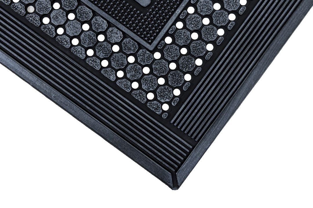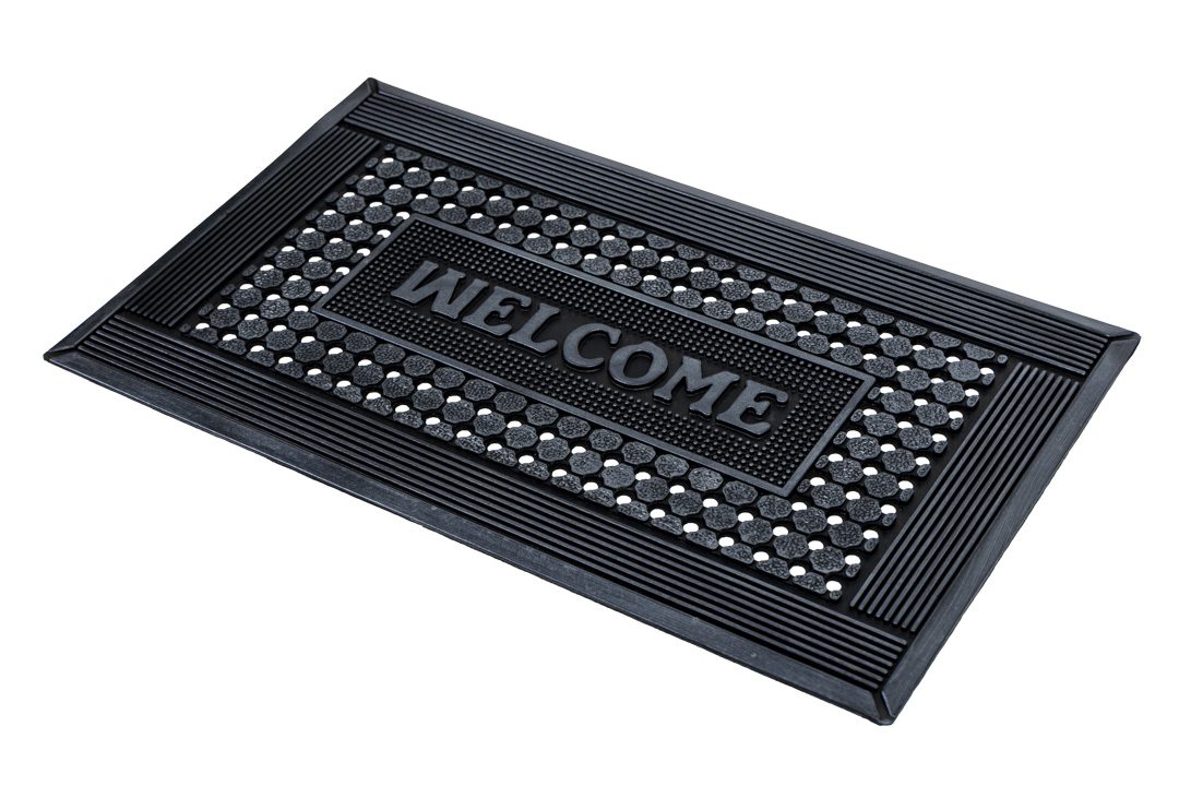 Verhoog de functionaliteit en uitstraling van je entree met deze decoratieve rubberen schraapmat. Deze veelzijdige mat is ideaal bij de ingang van je huis, garage of werkplaats. Het duurzame rubbermateriaal biedt uitstekende grip en bescherming tegen vuil en vocht. Door de open ringen wordt het vuil van uw schoenen geschraapt en dat blijft achter in de openingen. Het zilverkleurig dessin met tekst Welcome voegt een vleugje elegantie toe, terwijl het functionele blijft. Een rubberen mat is weersbestendig en slijtvast waardoor ze heel lang zal meegaan. Een groot voordeel van een rubberen schraapmat is dat ze zeer eenvoudig te reinigen zijn, gewoonweg afkloppen of afspoelen en ze zijn terug klaar voor gebruik.