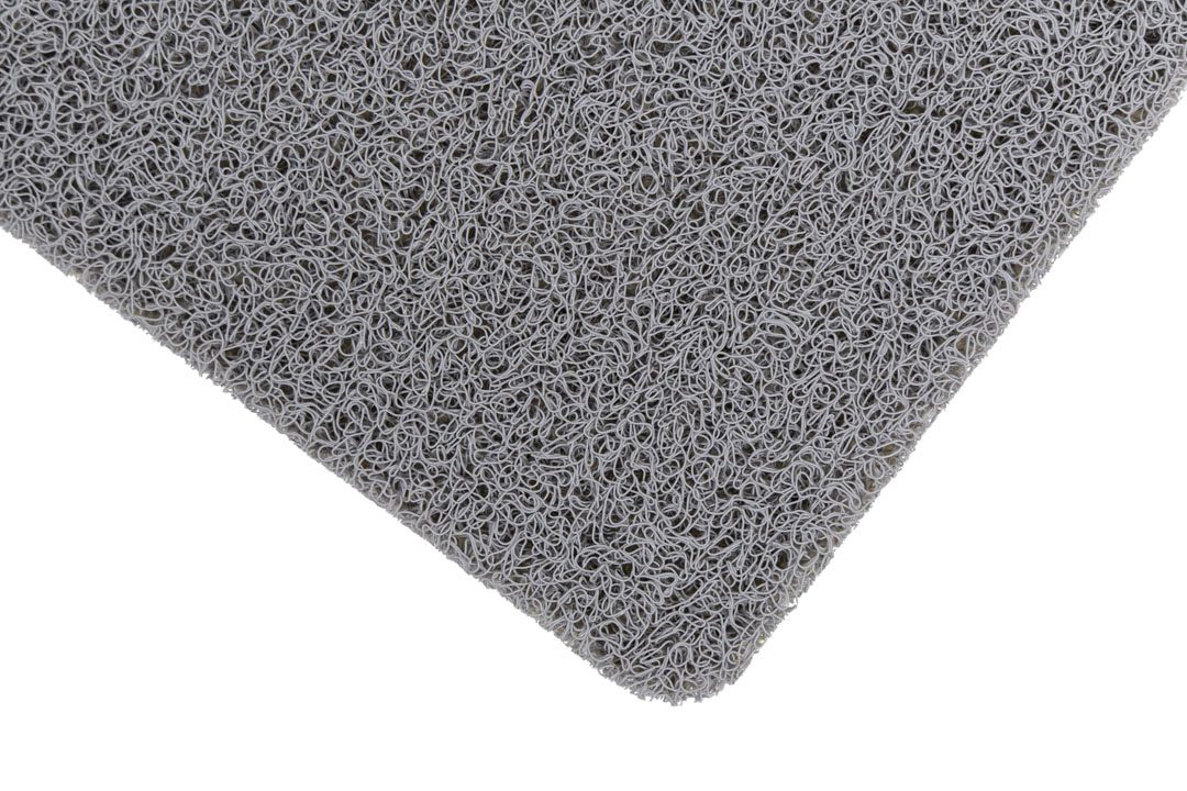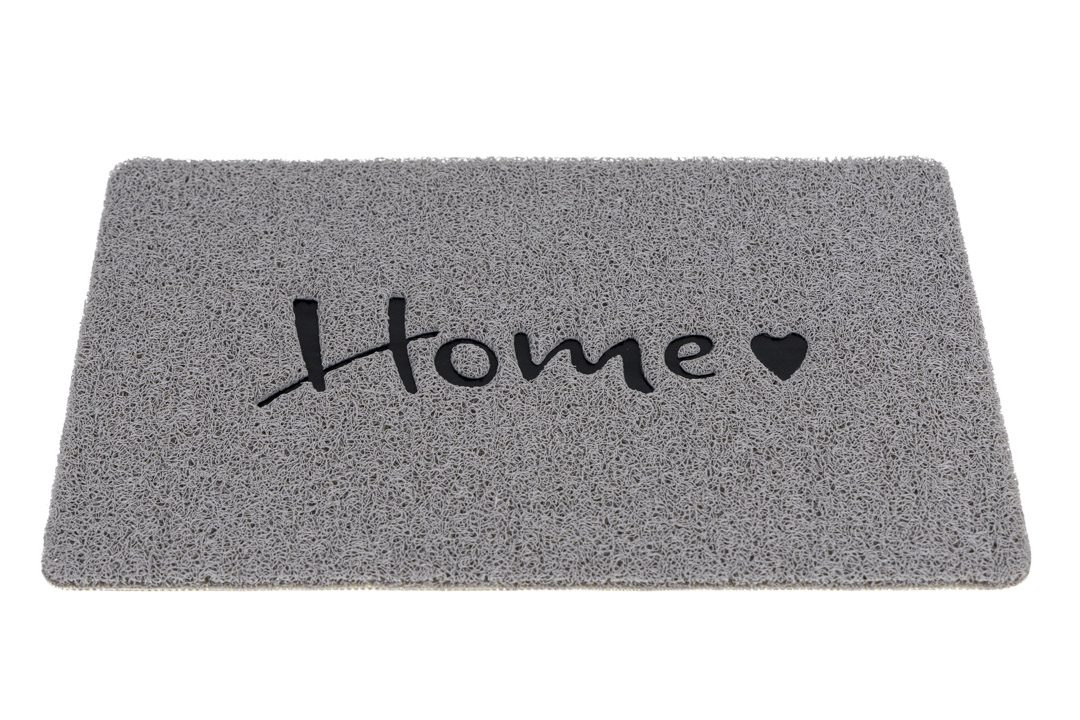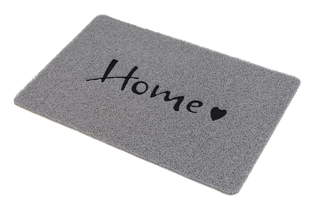 Deze grijze buitenmat met reliëfprint Home zorgt voor propere schoenen dankzij zijn lussenstructuur. Deze grijze spaghettimat is een echte buitenmat. Door de schrapende werking van de lussen wordt alle vuil buitenshuis gehouden en door de open backing loopt het water eenvoudig door de mat weg.