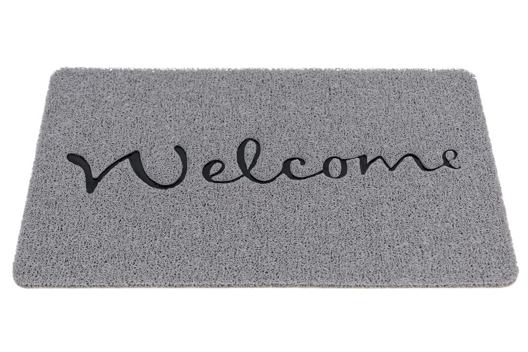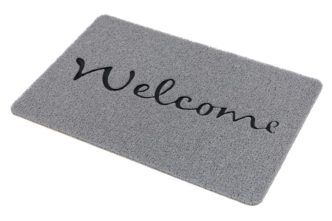 Deze grijze buitenmat met reliëfprint Welcome zorgt voor propere schoenen dankzij zijn lussenstructuur. Deze grijze spaghettimat is een echte buitenmat. Door de schrapende werking van de lussen wordt alle vuil buitenshuis gehouden en door de open backing loopt het water eenvoudig door de mat weg.