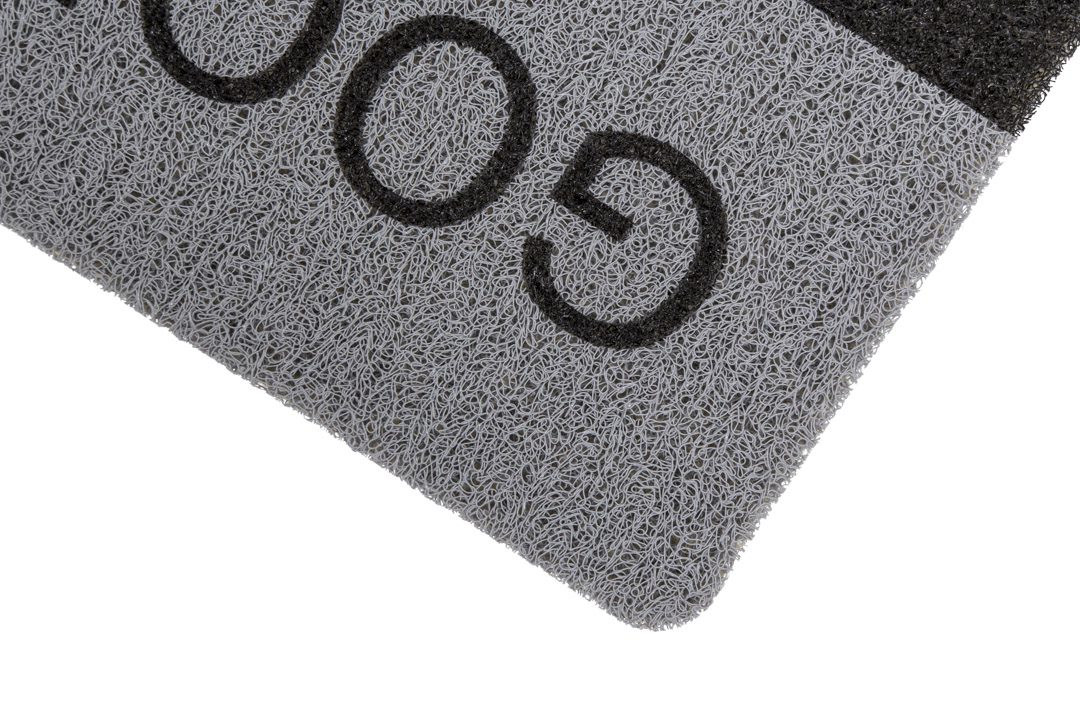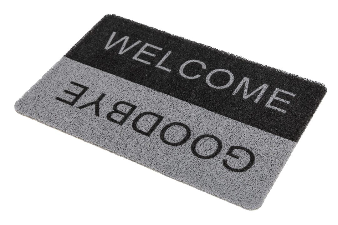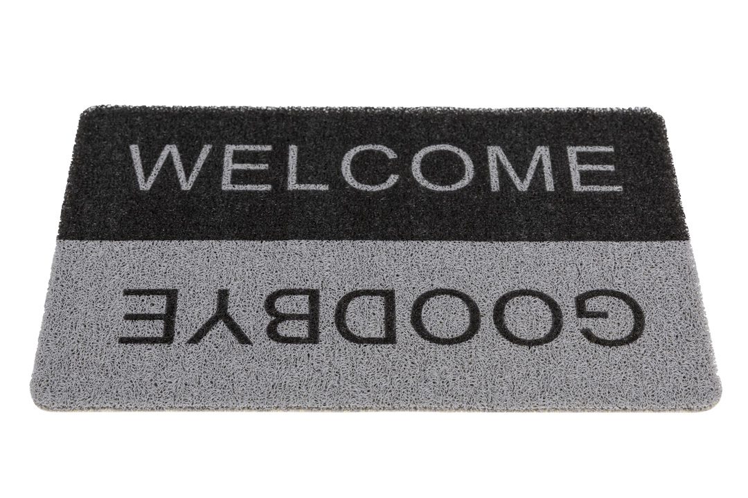 Deze buitenmat bedrukt met Welcome / Goodbye zorgt voor propere schoenen dankzij zijn lussenstructuur. Deze grijze spaghettimat is een echte buitenmat. Door de schrapende werking van de lussen wordt alle vuil buitenshuis gehouden en door de open backing loopt het water eenvoudig door de mat weg.